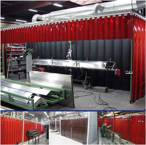 Schweißvorhänge und Schweißlamellen bieten in gleicher Weise Sichtschutz. Die Wahl, ob Vorhänge oder Lamellen, richtet sich nach der mechanischen Belastung. Bei regelmäßiger mechanischer Belastung oder großen Raumhöhen werden Lamellen eingesetzt.